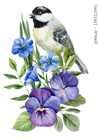 Chickadee bird with pansy and blue flax flowers watercolor illustration isolated on white spring botanical arrangement