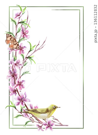 A vertical rectangular frame with a blossoming peach branch, a butterfly, and a bird. Isolated watercolor illustration for card design, invitations, interior design, and packaging printing.