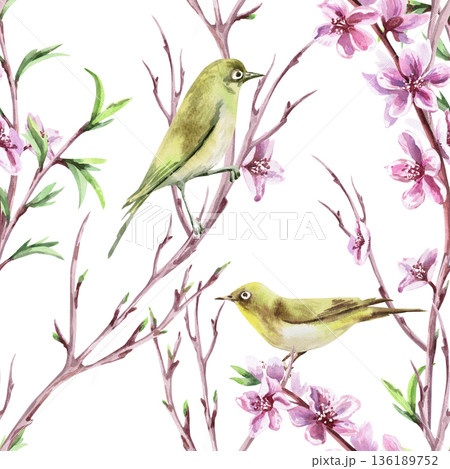 Seamless pattern with birds, branches, and peach blossoms. Watercolor illustration for packaging design, fabric printing, interior design, greeting cards, holiday decor, and souvenirs.