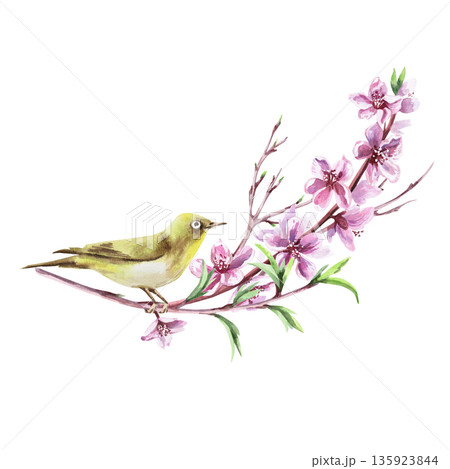 A peach blossom branch and a delicate Japanese white-eye bird. Isolated watercolor illustration in a realistic style for postcards, interiors, spring holidays, packaging, and poster printing.