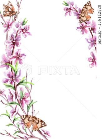 Vertical rectangular frame with blooming peach branches and butterflies. Isolated watercolor illustration for the design of postcards, invitations, interior, packaging printing.
