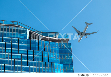 日本の東京都市景観 渋谷から望む航空機(左のビルは渋谷スクランブルスクエア)