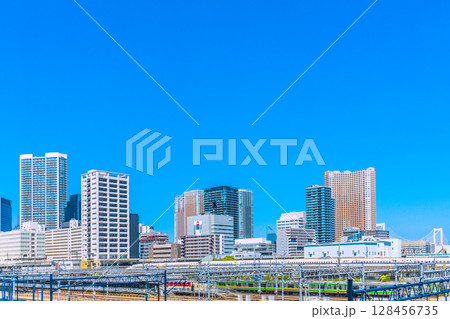 日本の東京都市景観 新幹線や山手線、芝浦アイランドケープタワーなど芝浦のタワーマンション群を望む