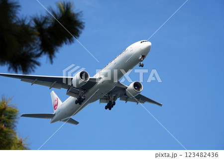 冬 快晴の城南島海浜公園上空から羽田空港に向かう旅客機逆光でキラリ