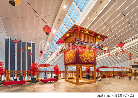 [東京・大田] 羽田空港国際線ターミナルのお祭り広場に立つ祭り櫓を照らす提灯と野点傘を飾る休憩所。