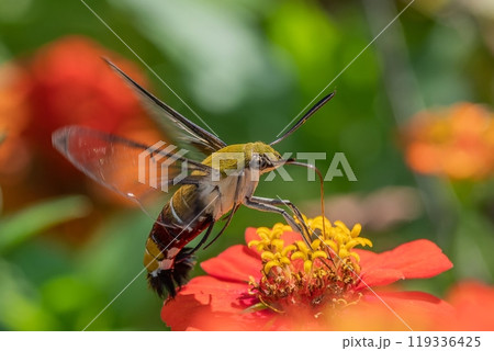 キバナコスモスの花の吸蜜をする、ホバリングする、オオスカシバ 06