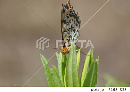 ツマグロヒョウモン 翅を閉じて草の葉っぱに止まっている