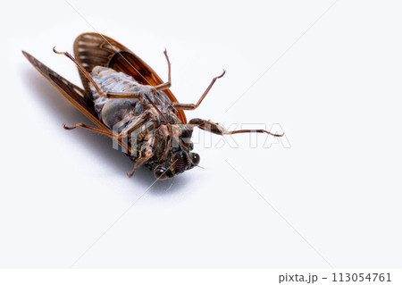 ひっくり返ったアブラゼミ(オス)を白背景で撮影した写真