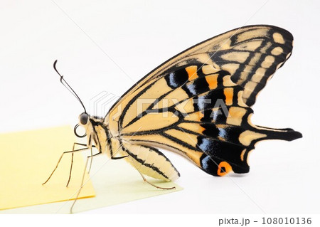 白バックで黄色と緑色の和紙の上に乗る横を向いた美しいナミアゲハ蝶