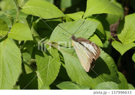 生き物 昆虫 タイワンシロチョウ、白い翅。茶褐色の縁取りとそこから翅脈に沿ってに突き出るギザギザ模様