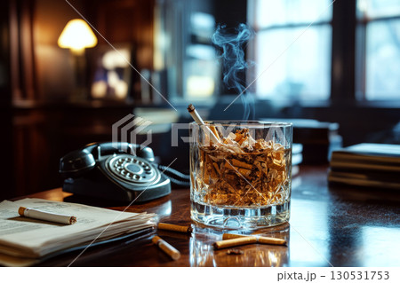A glass ashtray filled with cigarette butts is on a wooden desk alongside papers and a telephone. Concept of smoking habits and nostalgia. For a vintage lifestyle photo or health awareness.