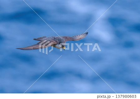 きれいな波紋の青い日本海の上を滑空するハヤブサの飛翔姿 野生動物のクローズアップ
