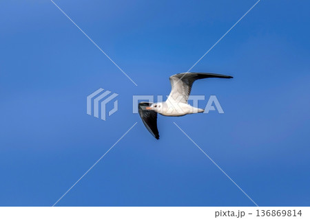 青空を悠々と飛ぶユリカモメの飛翔シーン、コピースペースのあるミニマルな背景