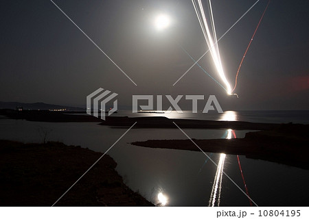 満月に照らされ天使が降りてきた 高知龍馬空港 着陸体勢の光跡