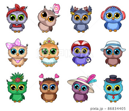 Cartoon owl. Cute owls in cap and scarf, funny baby wild forest animals. Comic art woodland characters, kids birds stickers, garish vector set