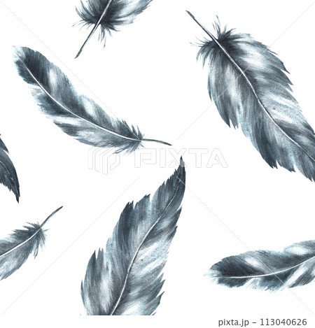 Watercolor seamless pattern with monochrome bird feathers grey black color with granulation of shades, ornaments. Quills wings drawing illustration. Wallpaper wrapping fabric Isolated white background