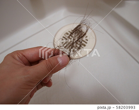 排水溝に溜まった髪の毛を指でつまみ絶望する女性の手
