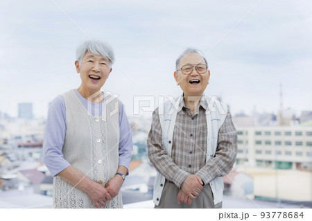 街を話しながら歩く日本人の高齢者夫婦(シニア・男女)
