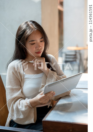A thoughtful Asian woman looks at her tablet with a pensive expression, working remotely at a cafe.