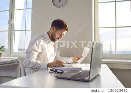Portrait of serious, focused, attractive businessman in white shirt sitting at written desk in his office.
