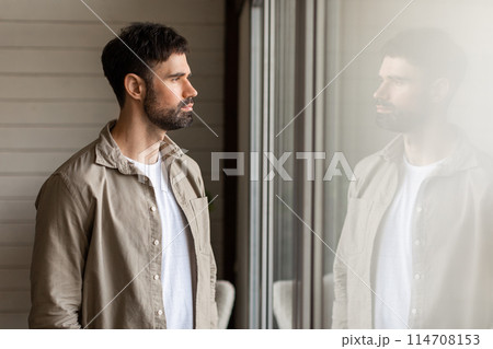 A man stands in a room facing a large window, looking out. The man appears thoughtful as he gazes outside, with his hands casually in his pockets, copy space