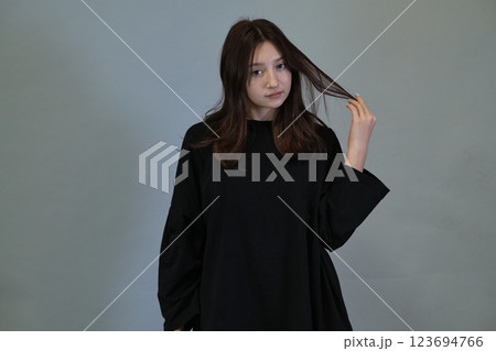 Contemplative young lady playing with her hair. Reflects the natural beauty and simplicity of real-life moments.