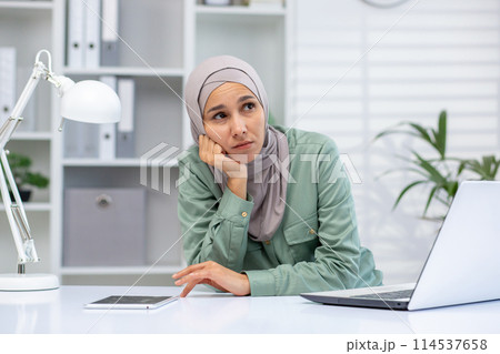 A young Middle Eastern woman wearing a hijab sits at her desk in an office, appearing pensive and thoughtful with a laptop and notebook in front of her.
