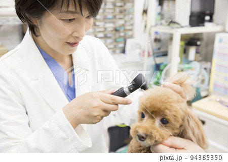動物病院で小型犬の耳の中を見る女性獣医手元