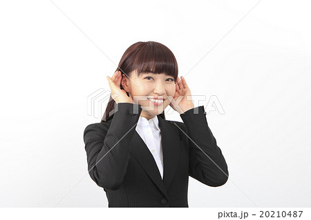 女性 ミドルエイジ 耳に手を当てて聞くジェスチャー 白背景 カメラ目線