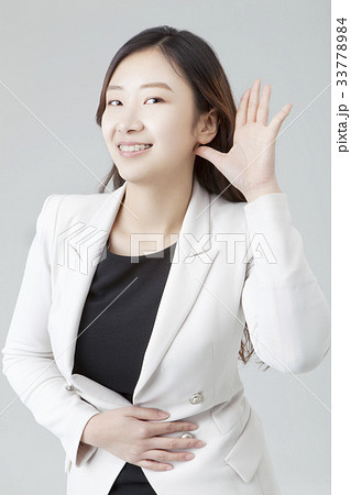 女性 美容看護師 耳に手を当てて聴く 白背景