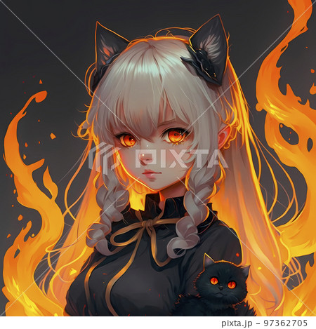 毛先が炎に包まれたブロンドヘアの少女「AI生成画像」