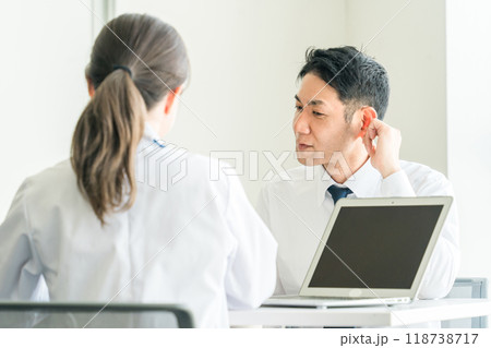 耳の不調を医師に相談するビジネスマン(難聴・耳鳴り・中耳炎)
