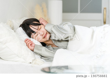 ベッドで睡眠中に騒音で耳を塞ぐ若いアジア人女性(騒音トラブル,安眠妨害,睡眠障害)