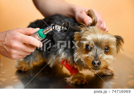 Veterinarian inspecting dog ears with otoscope on table at animal hospital