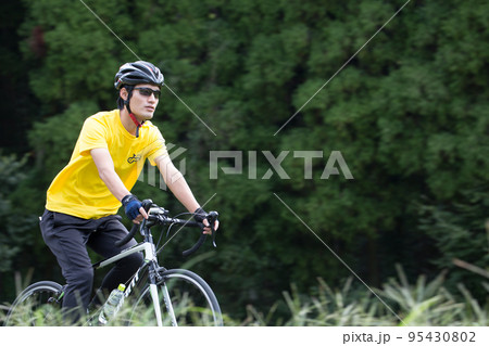 サイクリングの途中で立ち止まってスマホを見ている男性