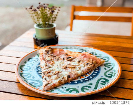 Slice of pizza with mushrooms on decorative plate. Italian cuisine, casual dining and delicious meal in cafe setting.