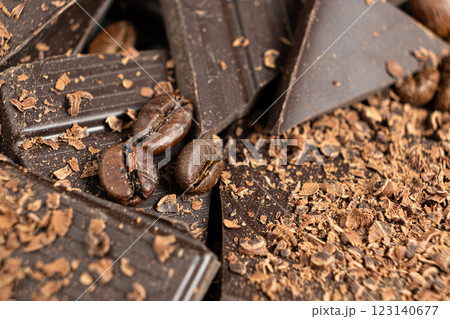 Grated dark chocolate, chips and coffee beans
