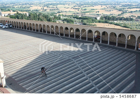 フランチェスコ聖堂の回廊とサイクリスト アッシジ イタリア