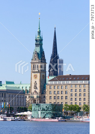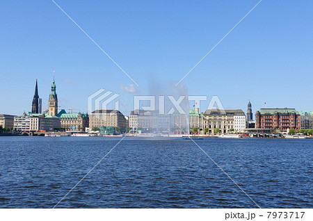 ドイツ 夕暮れのハンブルク旧市街とアルスター湖