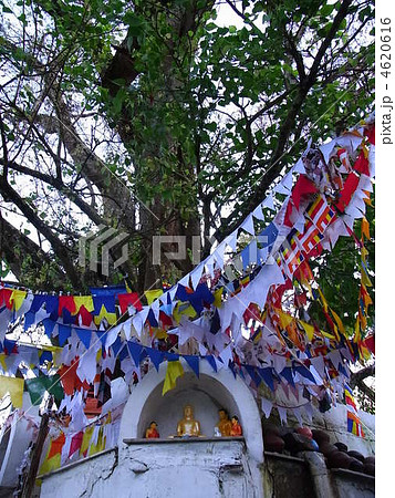 カラフルな仏旗がはためくすがすがしい仏歯寺