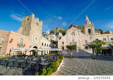 Square Piazza IX Aprile with San Giuseppe church and Clock Tower in Taormina, Sicily, Italy