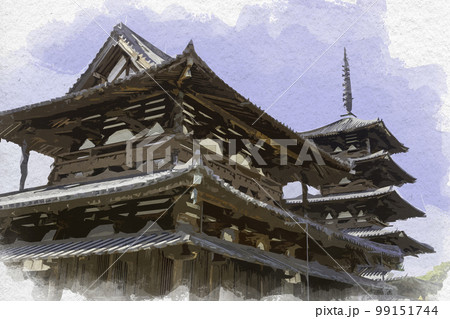 水彩画風 法隆寺 五重塔 奈良県生駒郡斑鳩町