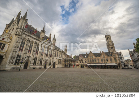 西ヨーロッパのベルギー 世界文化遺産のブルージュ(ブルッヘ)歴史地区 市庁舎のあるブルグ広場の夕景