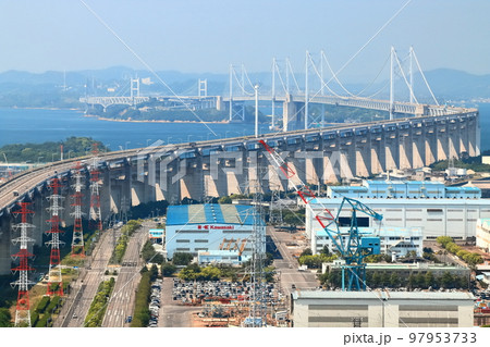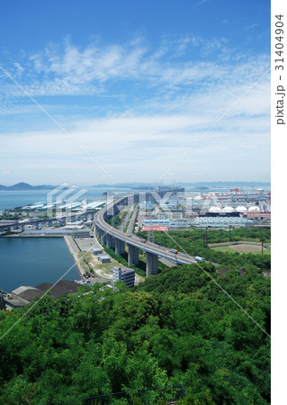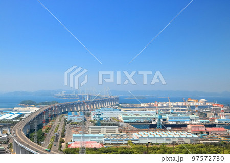 【香川県】夏の聖通寺山展望台から見た瀬戸大橋と番の州工業地帯 入道雲