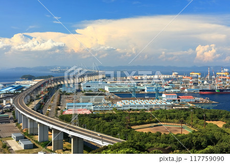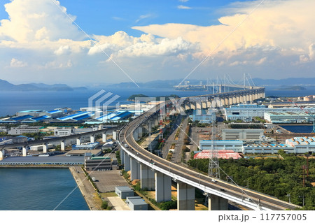 【香川県】夏の聖通寺山展望台から見た瀬戸大橋と番の州工業地帯 入道雲
