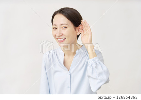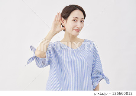 女性 ミドルエイジ 耳に手を当てて聞くジェスチャー 白背景