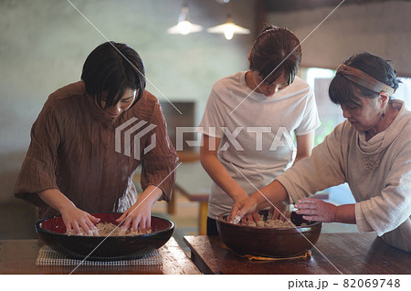 そば打ちをする女性