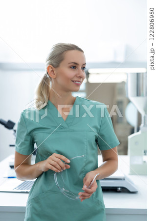 Female chemist in lab coat holding glasses in hands looking away in laboratory