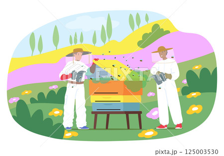 Apiculture farmers cartoon characters using bee smoker equipment for gathering honey scene