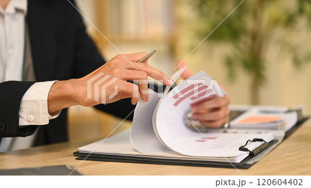 Close up of businessman reviewing documents with charts and graphs on a clipboard